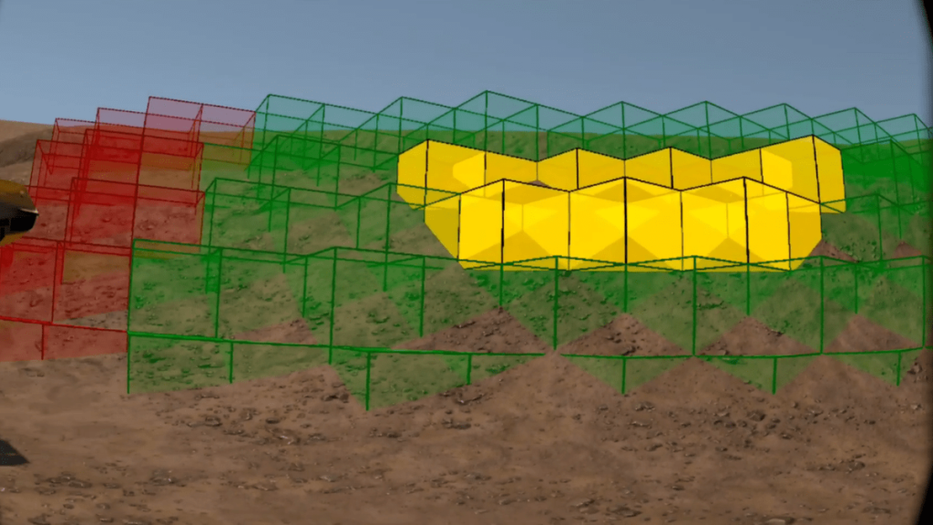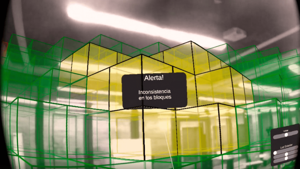 La solución se alimenta del modelo de bloques que es la forma de representar qué tanto material valioso hay en cada parte de la mina. A medida que la pala extrae material, esta se analiza con un sensor que está en la pala. Si existe una inconsistencia entre el modelo de bloques y el sensor de la pala se levanta una alerta. Con los dispositivos de realidad virtual el geógrafo puede ver desde su oficina los cambios que ocurren del modelo de bloques simulando que estuviera en terreno. Entonces, el geógrafo puede decidir si es necesario ir a terreno y evaluar nuevamente el material. Al ir a terreno puede, con los mismos lentes, ver en un entorno de realidad mixta donde ve el terreno real y el modelo de bloques virtual. Ahí puede interactuar con los bloques y determinar si tiene material valioso o no para que los otros actores puedan tomar decisiones con esa información.