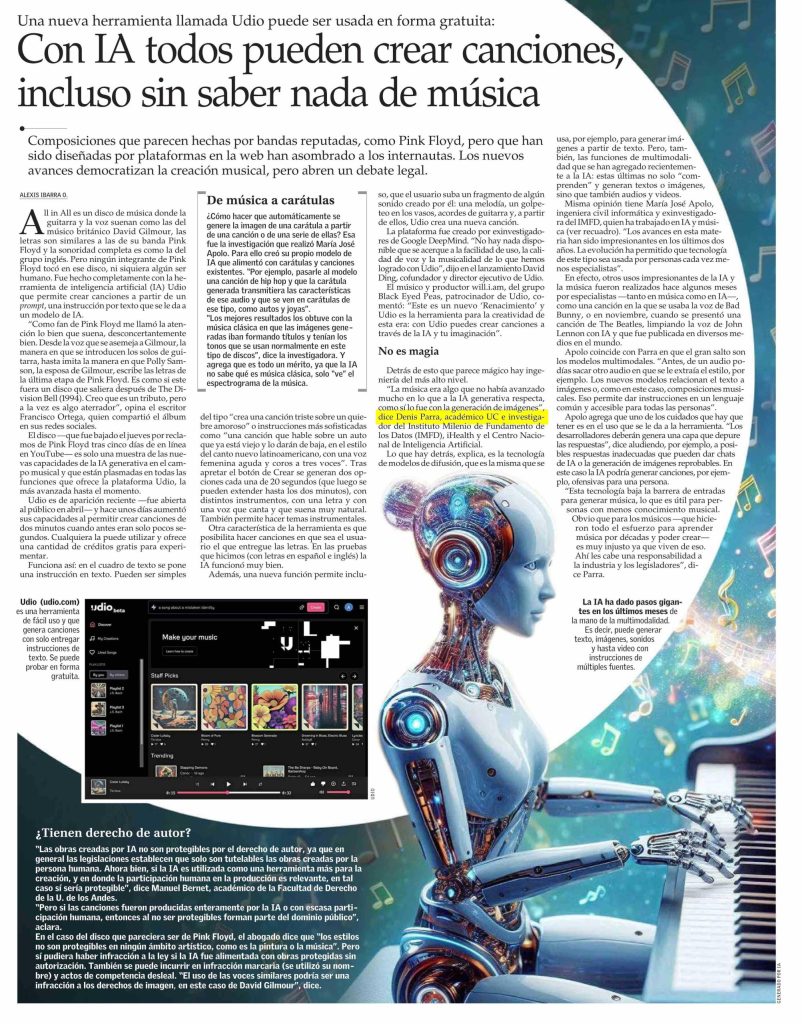 En la nota, el profesor Denis Parra, detalla que esta herramienta trae ingeniería de punta “la música era algo ue no había avanzado mucho en lo que a la IA generativa respecta, como sí lo fue con la generación de imágenes”.